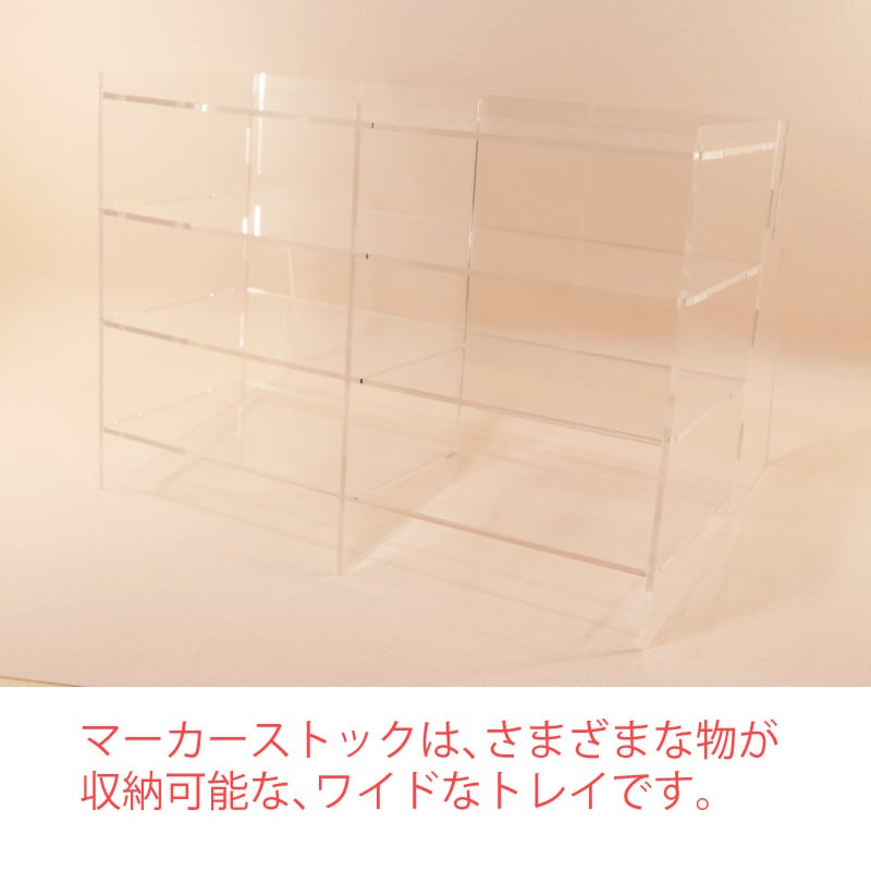 アルコールマーカーや、さまざまなものを収納できる、美しいアクリルトレイです。コピックスケッチなら228本収納可能です。組み立て式で、不要の際は分解して収納できます。